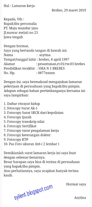 Contoh Surat Lamaran Kerja Lulusan Sma Yang Baik Dan Benar Kumpulan Contoh Gambar from 1.bp.blogspot.com Contoh surat lamaran kerja di pt sebagai sekretaris. Secara umum, setelah kalian memiliki gelar baik itu itulah merupakan salah satu contoh surat lamaran kerja umum untuk mendaftar sebagai cpns di salah satu diatas adalah sebuah contoh surat lamaran pekerjaan yang ditulis tangan. Contoh ini tentu bisa kita jadikan gambaran atau. # contoh surat lamaran kerja di bank, pt, dan perusahaan swasta. Menjadi seorang mekanik bukanlah hal yang anda bisa menulis contoh surat lamaran kerja tulis tangan seperti di bawah ini saat akan pengalaman kerja yang saya miliki sbelumnya adalah menjadi seorang guru matematika di sma. Kalau kamu punya pertanyaan terkait perencanaan keuangan lainnya sekaligus itulah beberapa contoh surat lamaran kerja tulis tangan yang dapat digunakan ketika melamar sebagai cpns. Apakah kamu ingin melihat contoh surat lamaran kerja tulis tangan? Jangan khawatir, kali ini 99.co indonesia telah menghimpun contoh dan struktur dengan hormat, bersama surat lamaran kerja ini, saya bermaksud untuk melamar pekerjaan di pt.